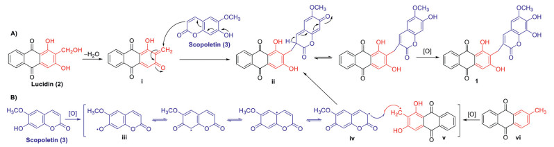 The plausible biosynthetic pathways are proposed in Scheme 1. The biosynthetic precursors of 1 are traced to lucidin (2) and scopoletin (3). Lucidin is the major component from the title plant and shares the same substitution pattern as that of the anthraquinone moiety of 1. Only a furanocoumarin, cnidilin, was obtained from K. valerianoides [19], thus the 7-hydoxrycoumarin derivative, scopoletin, was proposed to be another precursor. Briefly, dehydration of 2 could produce intermediate i. Then, a conjugate addition of i with 3 could yield ii [20], which undergoes further oxidation to afford 1 (Scheme 1A). Alternatively, the biosynthesis might involve a free radical coupling reaction (Scheme 1B). Scopoletin (3) is still presumed to be a precursor. 3 undergoes initial oxidation through hydrogen atom abstraction from the 7′-OH to form a free radical intermediate iii. The free radical at 7′-O in iii migrates to C-3′ to produce radical iv [21], which suffers a radical coupling with the benzylic radical intermediate v generated in the oxidation process of anthraquinone precursor vi to form ii.