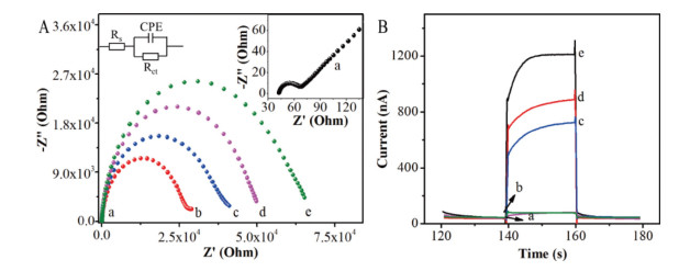 | Fig. 3. (A) EIS responses of electrodes: (a) bare GCE, (b) BTA-C4Ph/GCE, (c) BTA-C4Ph-PM6/GCE, (d) BTA-C4Ph-PM6/anti-EpCAM-MNs/GCE, (e) BTA-C4Ph-PM6/anti-EpCAM-MNs/MCF-7/GCE. Supporting electrolyte: 5.0 mmol/L K3Fe(CN)6/K4Fe(CN)6 (1:1) containing 0.1 mol/L KCl. (B) Photoelectric responses of electrodes: (a) PM6/GCE, (b) BTA-C4Ph/GCE, (c) BTA-C4Ph-PM6/anti-EpCAM-MNs/MCF-7/GCE, (d) BTA-C4Ph-PM6/anti-EpCAM-MNs/GCE, (e) BTA-C4Ph-PM6/GCE. PEC test was in 0.01 mol/L PBS (pH 7.2~7.4) at a bias potential of −0.3 V (vs. Ag/AgCl) under visible lightirradiation (λ > 420 nm). | |
