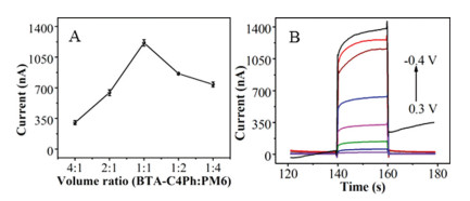 | Fig. 4. (A) Photocurrent responses of electrodesmodified with different volume ratios of BTA-C4Ph and PM6. (B) Photocurrent responses of electrode at different voltages. PEC test was in 0.01 mol/L PBS (pH 7.2~7.4) at a bias potential of −0.3 V (vs. Ag/AgCl) under visible lightirradiation (λ > 420 nm). | |