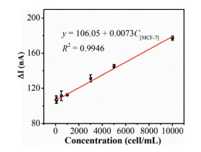 Breast cancer is a malignant tumor with the highest incidence rate and is the second fatal rate among women [1]. Early diagnosis is the main means to reduce the mortality and morbidity of breast cancer [2]. Michigan cancer foundation-7 (MCF-7) is one type of human breast cancer cells. Currently, various analytical techniques are reported for MCF-7 detection, including differential pulse voltammetry (DPV) [3], electrochemiluminescence (ECL) [4], electrochemical impedance spectroscopy (EIS) [5, 6], inductively coupled plasma-mass spectrometry (ICP-MS) [7], localized surface plasmon resonance (LSPR) spectra [8], Fluorescence spectra [9] etc. However, development of approach for MCF-7 detection in human blood with high selectivity and sensitivity are still highly required for early breast cancer diagnosis.