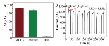 To study the reproducibility of the PEC sensor, three sensors were prepared for the detection of 1 × 104 cell/mL MCF-7. The RSD is 1.19%, indicating good reproducibility. Moreover, the stability of the PEC assay was researched by continuous 'on-off' irradiation under a xenon lamp. As shown in Fig. 6B, after 8 consecutive on-off cycles of irradiation, the background photocurrent was basically unchanged with RSD of 5.85%, indicating that the PEC sensor has good stability.