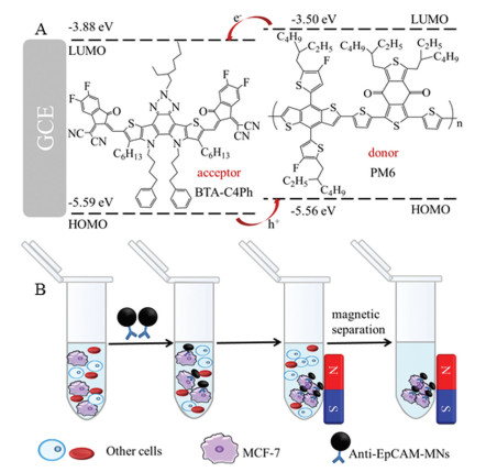 To prepare the PEC sensor, BTA-C4Ph-PM6 heterojunction hybrid was sonicated for 10 min, and then 10 µL BTA-C4Ph-PM6 mixed solutions was added onto the surface of cleaned GCE. After dried under infrared light, 30 µL anti-EpCAM-MNs-MCF-7 compounds was dropped on the surface of the modified electrode, which was incubated in an oven at 37 ℃ for 1 h, and rinsed with DI water for testing.