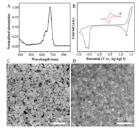 | Fig. 2. (A) Normalized absorption spectra of BTA-C4Ph in the chloroform. (B) Cyclic voltammogram of BTA-C4Ph (a) and Fc/Fc+ (b). (C) SEM image of Fe3O4 MNs. (D) TEM image of BTA-C4Ph-PM6. | |