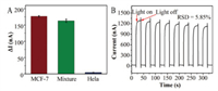 | Fig. 6. (A) The selectivity of the PEC assay for determining MCF-7 cells. (B) The stability of PEC sensor. PEC test was in 0.01 mol/L PBS (pH 7.2~7.4) at a bias potential of −0.3 V (vs. Ag/AgCl) under visible lightirradiation (λ > 420 nm). | |