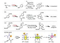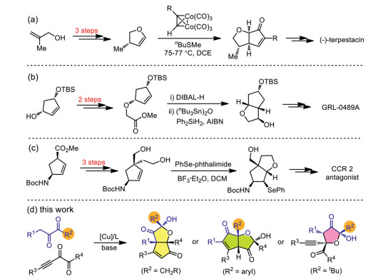 On the other hand, cis-hexahydro-2H-cyclopenta[b]furan (HCPF) and 2-hydroxydihydrofuran-3(2H)-one (HDFO) widely occur in natural products and pharmaceutically active substances (Fig. 1) [16-22]. Specifically, spirotrichilin A shows anti-inflammatory activity on NO production in certain cell line [16], kuhistaferone displays moderate cytotoxicity against the human tumor cell in HCT116 [17], and gracilioether J has antileishmanial activity [18]. Moreover, GRL-0489A displays remarkable enzyme inhibitory and antiviral potency, and its antiviral activity against multidrug resistant HIV-1 variants is even higher than FDA approved inhibitors [16]; antagonists of the CC-chemokine receptor 2 (CCR2) have been vigorously pursued by many pharmaceutical companies as a target for drug discovery, because the compound could have the potential for use in the acute and chronic conditions of inflammatory and autoimmune diseases [20]. However, rapid construction of both HCPF and HDFO skeletons in an efficient and stereoselective manner is still a challenge, and most of the known reports employ a sequential construction strategy to make bicyclic HCPF structures, and one-step method to form the bicycles starting from acyclic substrates remain scarce. For example, Jamison and co-workers completed the total synthesis of (-)-terpestacin, and the four-step synthesis of HCPF derivative laid the foundation of the whole process (Scheme 1a) [23, 24]. Similarly, two four-step methods were both used to make the bicyclic HCPF rings for the synthesis of GRL-0489A (Scheme 1b) [19] and CCR 2 antagonist (Scheme 1c) [20]. In all the above case, pre-existed ring structures were used to make the second ring units and multiple steps were always needed, which rendered the synthesis of HCPF skeletons less efficient and less atom-economic.