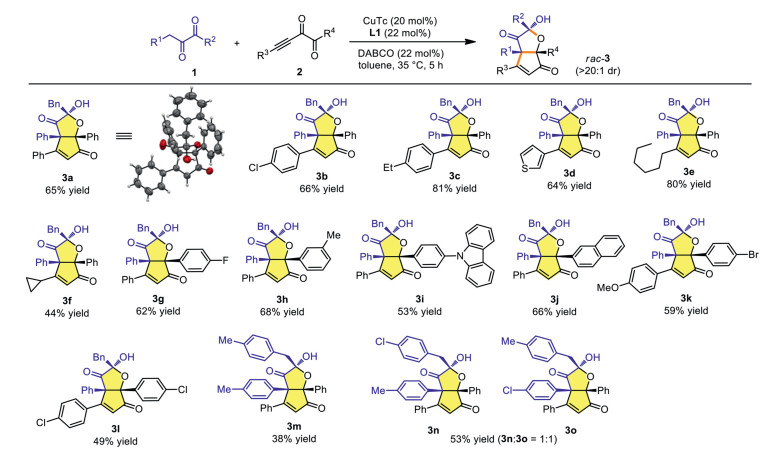 | Scheme 2. Scope of functionalized HCPF 3 formation. Reactions conditions: 1 (0.3 mmol), 2 (0.2 mmol), CuTc (20 mol%), DABCO (22 mol%), L1 (22 mol%), toluene (1 mL), 35 ℃, 5 h, under argon atmosphere. The diastereomeric ratios were determined via 1H NMR analysis of the reaction mixtures. All isolated yields were based on 2. | |