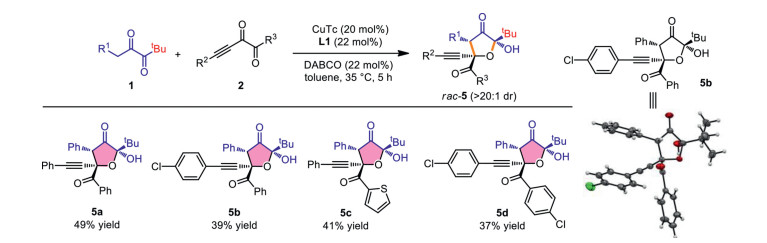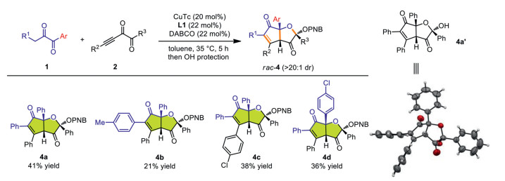 Further survey of the nucleophilic diketones showed that when 1 were aryl substituted diketones, a thoroughly different reaction pathway was applied for the reaction, and relatively stable bicyclic products 4a were isolated after the OH protection using p-nitrobenzoyl (PNB) group (Scheme 3, 4a). The variation of R1, R2 and Ar groups all proved successful, releasing 4b, 4c and 4d, respectively. Both the annulation and the OH protection steps were performed in moderate yields, thus resulting the relatively low total yields. Furthermore, When tBu-substituted diketones were studied, we found that the third mechanism predominated in the reaction, affording 2-hydroxydihydrofuran-3(2H)-one (HDFO) type products through a formal [3 + 2] annulation (Scheme 4, 5a−5d). The reaction proved slow and certain amount of starting materials remained after 5 h. Both products 4 and 5 have three stereogenic centers and were formed with high diastereoselectivities (> 20:1 dr). Moreover, 4a' and 5b were all confirmed via X-ray single-crystal structure analysis. Nucleophilic diketones with aliphatic R1 such as Me have also been tested but showed low reactivities in forming the corresponding annulation products. Alkynyl diketones with alkyl R3 substituent such as Me failed to deliver the corresponding products, and side reactions were detected.