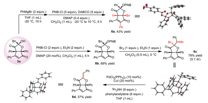 A series of further transformations using 3a can be achieved. As shown in Scheme 5, an unexpected rearrangement occurred when 3a was treated by PhMgBr, and after OH protection, 6a was formed with high diastereoselectivity. In this reaction, the Grignard reagent might act as a strong base to facilitate the ring opening of 3a, and the corresponding intermediate then undergoes a similar transformation as that occurs in the formation of 4. The protection of 3a afforded 6b in 69% yield and dibromide 6c could be produced from 6b in good yield with the treatment of Br2. Debromination of 6c under transition-metal catalysis allowed access to 6d The configuration of 6a, 6c and 6d were all confirmed unambiguously via X-ray structure analysis.