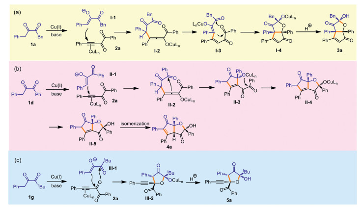 The possible mechanisms for the diversified formation of three types of products are shown in Scheme 6. For product 3a, the deprotonation of 1a leads to enolate Ⅰ-1, and after addition of Ⅰ-1 to 2a, allenolate Ⅰ-2 is formed. A new type of enolate Ⅰ-3 is produced from the proton transfer within Ⅰ-2, and the following aldol reaction initiates a formal [3 + 2] annulation to release Ⅰ-4, and after protonation, 3a is obtained (Scheme 6a). As to the formation of 4a (Scheme 6b), after the Michael addition of enolate Ⅱ-1 to 2a, Ⅱ-2 is formed, and the attack of phenyl ketone by the allenolate gives Ⅱ-3. Then after the intramolecular annulation and protonation, Ⅱ-5 is generated. The isomerization happens for Ⅱ-5 to deliver more stable product 4a. tBu-substituted 1g also produces enolate species Ⅲ-1 as the first step, but then the internal carbonyl of 2a is attacked by Ⅲ-1, and after a formal [3 + 2] annulation and protonation, 5a is formed (Scheme 6c). Because the reaction cannot occur without CuTc catalyst, we postulate that copper salt is to activate the alkynyl diketones [32-34]. As to the mechanism divergence between 1a and 1d, after the initial Michael additions, phenyl ketone seems to be more active than benzyl ketone, thus is attacked by the allenolate intermediate.