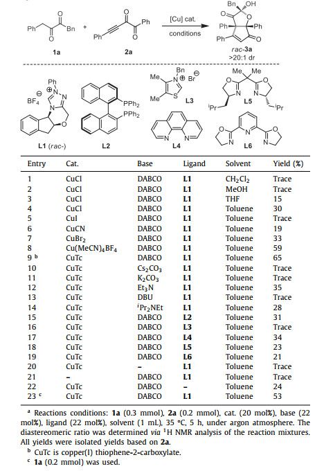 As shown in Table 1, 1a and 2a were selected as the model substrates to test the corresponding annulation reactivity. Copper salts were employed to catalyze the process owing to the known abilities of copper in activating ynones [28-32]. Our initial test using CuCl as the catalyst, racemic N-heterocyclic carbene L1 as the ligand, DABCO as the base, and CH2Cl2 as the solvent did not afford noticeable product (Table 1, entry 1). The solvent of MeOH was also not suitable for the reaction (Table 1, entry 2). To our delight, the use of THF and toluene was able to produce 3a in 15% and 30% yield, respectively (Table 1, entries 3 and 4). 3a contains a cis-bicyclic HCPF structure with ketone, enone, and hydroxy functionalities installed, and was obtained as the single diastereoisomer. Considering the importance of HCPF type compounds in organic synthesis and drug discovery, we continued the study to improve the yield of 3a. Using toluene as the solvent, we surveyed a series of copper catalysts such as CuI, CuCN, and CuBr2, but they could not further improve the yield of 3a (Table 1, entries 5−7). However, Cu(MeCN)4BF4 and CuTc (copper(Ⅰ) thiophene-2-carboxylate) showed better performance (Table 1, entries 8 and 9) and CuTc led to 3a in 65% yield. Then using CuTc, a series of other bases such as Cs2CO3, K2CO3, Et3N, DBU and iPr2NEt were tested, but no better yield of 3a was obtained (Table 1, entries 10−14). More different types of ligands such as bisphosphine L2, thiazolium L3, 1, 10-phenanthroline L4, and Box-ligands L5-L6 were also studied, but no higher yield was detected although most of them could deliver 3a in certain yields (Table 1, entries 15−19). Control experiments in the absence of DABCO or CuTc could not furnish 3a (Table 1, entries 20 and 21), indicating that both base and copper catalyst are necessary for the reaction. Only 24% yield of 3a was gotten without ligand (Table 1, entry 22), demonstrating that ligand is able to accelerate the annulation process. Equal amount of 1a was found to decrease the total yield of 3a (Table 1, entry 23).