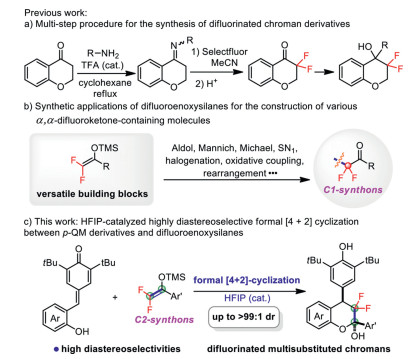 In summary, an efficient direct formal [4 + 2] cyclization of ortho-hydroxyphenyl p-QMs and difluoroenoxysilanes via HFIP catalysis has been developed. This novel metal-free strategy provides a convenient method to access a variety of multiply functionalized difluorinated chromans with high to excellent diastereoselectivities. By using this method we successfully demonstrated that difluoroenoxysilanes can be commendably applied as C2 synthons, which would bring new opportunities to access structurally diverse cyclic difluorinated molecules efficiently.