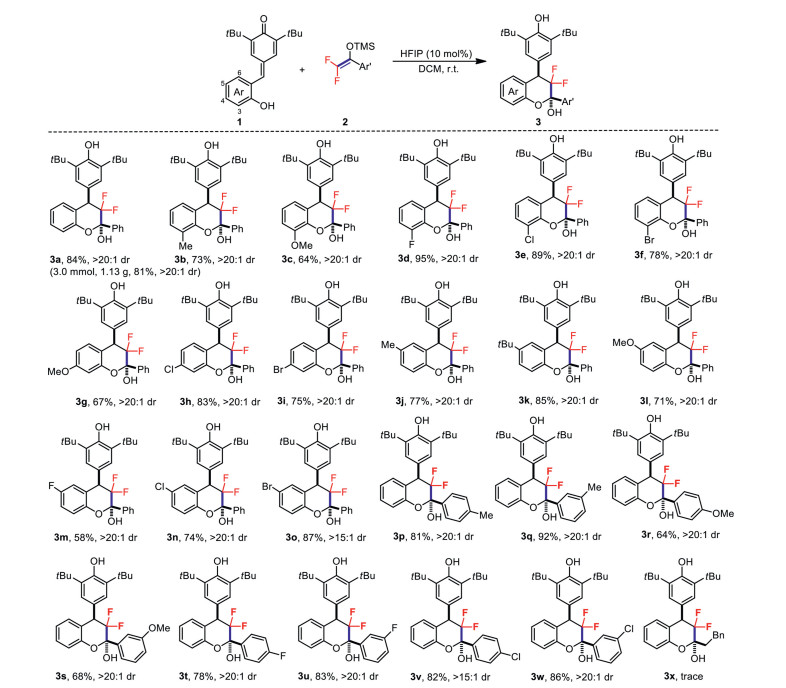Difluoroenoxysilanes, interesting fluorinated silyl enol ethers, could be easily obtained by the reaction of Mg-mediated C-F bond cleavage of trifluoromethyl ketones, and have been recognized as versatile building blocks for the construction of diverse α, α-difluoroketone-containing molecules [10, 11]. Generally, the reactions of difluoroenoxysilanes mainly involve nucleophilic addition to unsaturated precursors such as aldehydes, ketones, imines and olefins [12-16], nucleophilic substitution of alkyl halides, alcohols or substrates with other leaving groups [17-19], halogenations [20], oxidative coupling [21] and rearrangement reactions [22] lead to numerous α, α-difluoroketone derivatives (Scheme 1b). In spite of elegant achievements, difluoroenoxysilanes usually act as C1 synthons to participate the rapid construction of functionalized α, α-difluoroketones in these reported reaction patterns. Therefore, it is highly desirable to develop new transformation models of difluoroenoxysilanes from the view of expanding the structural diversity of the designed molecules. In order to realize the highly efficient construction of multiply functionalized difluorinated chromans, we envisaged that the generated difluoroketone carbonyl group could be further utilized as an electrophilic site to facilitate the subsequent transformations to forge difluorinated cyclic compounds despite its being rarely explored possibly due to the low reactivity in previous studies [10, 11]. Correspondingly, difluoroenoxysilanes serve as C2 synthons in constructing CF2-engineered chromans for this new reaction pattern. Concerning the excellent performance of ortho-hydroxyphenyl para-quinone methides (p-QMs) in cyclization reactions for synthesizing chroman derivatives [23-29] and our continued interest in developing new catalytic routes to fluorine-containing molecules [16, 18, 19, 22], we herein reported a HFIP-catalyzed highly diastereoselective synthesis of difluorinated multisubstituted chromans via the formal [4 + 2] cyclization of ortho-hydroxyphenyl p-QMs with difluoroenoxysilanes (Scheme 1c). By taking advantage of this scheduled procedure, a series of highly functionalized difluorinated chromans were efficiently prepared in high diastereoselectivities.