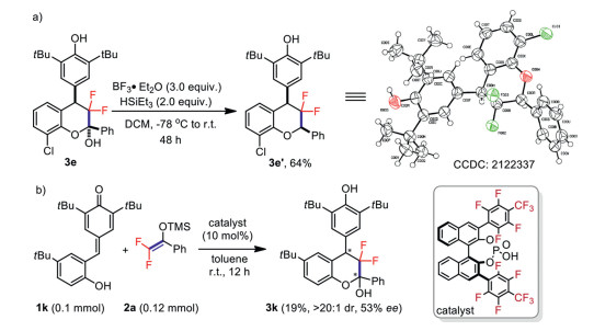 To demonstrate the synthetic utility of this HFIP-catalyzed formal [4 + 2] cyclization reaction, a gram-scale synthesis was conducted. As shown in Scheme 2, the desired difluorinated chroman 3a was obtained in a maintained level of yield and diastereoselectivity. Furthermore, the dehydroxylated structural product 3e′ which is widely exist in bioactive molecules showed in Fig. 1 could also be smoothly obtained with high diastereoselectivity by reductive dehydroxylation of 3e (Scheme 3a). Of particular interest, during the following investigations we found that these difluorinated hemiacetals were perfectly stable under acidic conditions, which shows the great difference between fluorinated and non-fluorinated hemiacetals (the relative configuration of compound 3e′ was determined by X-ray crystallography analysis and studies on the properties of difluorinated multisubstituted chromans, see Supporting information for details). Subsequently, great efforts had been made to developing a catalytic asymmetric variant of this formal [4 + 2] cyclization reaction. It was found that product 3k could be obtained in 19% yield with > 20:1 dr and 53% ee with multiple attempts in the presence of heptafluoro-p-tolyl-substituted chiral monophosphoric acid (Scheme 3b). Though the result is not satisfactory, it also provided a new insight into the development of asymmetric formal [4 + 2] cyclization reaction with difluoroenoxysilanes. Further efforts are underway to develop the catalytic asymmetric version of this reaction with newly designed chiral fluoroalcohol catalysts and the results will be reported in due course.