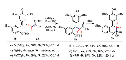 Control experiments were also carried out to gain insight into the reaction mechanism of this cyclization process (Scheme 4). The experiments with TBS-protected substrate 1k' showed that the densely functionalized difluorinated chromans were obtained via a sequential 1, 6-conjugate addition of ortho-hydroxyphenyl p-QMs with difluoroenoxysilanes and subsequent hemiacetalization of the resulting intermediates. Obviously quite different catalytic performance of the used catalysts was observed in this stepwise conjugate addition process, which indicated that the OH group plays a key role in the HFIP-catalyzed formal [4 + 2] cyclization reaction of ortho-hydroxyphenyl p-QMs and the excellent diastereoselectivity of the final products was induced by the special skeleton of the addition intermediates.