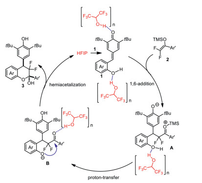 Based on these experiments results and related references [31-37], a proposed mechanism is illustrated in Scheme 5 to explain the reaction process. First, the carbonyl group of ortho-hydroxyphenyl p-QMs 1 is activated by HFIP through hydrogen-bond interaction. On the other hand, the hydrogen-bond interaction between phenolic OH of p-QMs and HFIP may help to improve the reactivity of ortho-hydroxyphenyl p-QMs in 1, 6-addition process. Then, the 1, 6-conjugate addition with difluoroenoxysilanes 2 smoothly affords the desired intermediate A. Finally, after a proton-transfer process and subsequent hemiacetalization, the desired difluorinated chromans 3 are obtained along with the release of HFIP catalyst. It should be noted that the activation potential of HFIP on difluoroenoxysilanes in this formal [4 + 2] cyclization reaction should not be completely ruled out according to our previous study [18].
