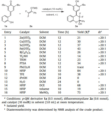 First, ortho-hydroxyphenyl p-QM 1a and difluoroenoxysilane 2a were chosen as the model substrates to examine the feasibility of the envisaged formal [4 + 2] cyclization reaction (Table 1). It was found that the common metal salt Lewis acid catalysts such as Zn(OTf)2, Cu(OTf)2, Sc(OTf)3 and Fe(OTf)3 could promote this formal [4 + 2] cyclization reaction providing the desired highly functionalized difluorinated chroman 3a with excellent diastereoselectivity (entries 1–4, > 20:1 dr). However much lower catalytic efficiency of metal triflate catalysts were observed in these reactions compared with previous reported highly efficient Fe(Ⅲ)-catalyzed 1, 6-conjugate addition of difluoroenoxysilanes to non-ortho-hydroxyphenyl-substituted p-QMs [30], which clearly indicated that the free phenolic OH had an important effect on the 1, 6-addition process (see the control experiments in for more details). Based on these results, we turned our attention to different types of Lewis acids or Brønsted acids, such as B(C6F5)3, Tf2NH, TfOH, PTSA and PhCO2H were evaluated but did not provide a better result (entries 5–9). Inspired by the superior catalytic performance of HFIP for OH-containing substrates in the construction of fluorinated molecules in our previous studies [18, 19], HFIP was then considered as a promising alternative to access the difluorinated chroman products more effectively. As expected, the desired cyclization product 3a was obtained smoothly in high yield with excellent diastereoselectivity (entry 10, 84% yield, > 20:1 dr). Further investigations showed that the multiple fluorine atoms and the solvent had a great influence on the reaction (entries 11–16). Thus the optimal reaction conditions for the formal [4 + 2] cyclization reaction were determined by using 10 mol% HFIP as the catalyst and DCM as the solvent at room temperature.