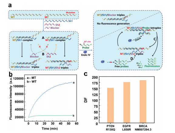 Herein, we designed a new enzyme-assisted DNA probe system called shared-probe system. The assay was based on Endonuclease Ⅳ (Endo Ⅳ), which has a very high affinity to double strand DNA (dsDNA) [40-44]. Endo Ⅳ can recognize the apurinic/apyrimidinic (AP) site in dsDNA and degrade the single strand that contains the AP site. The oligonucleotide components and detection process were shown in Fig. 1a. The shared-probe system contained four types of DNA: double labelled DNA probe with AP site, substrate to be tested (MT/WT, MT is mutant-type substrate and WT is wild-type substrate), blocker strand, and Sh1/Sh2 strands to bridge DNA probe and substrate. The Sh1/Sh2 strands consisted of 2 parts, which were probe binding region (PBR) and substrate binding region (SBR). For Sh1, its PBR is perfectly matched with an 11-nt segment of the probe at 3′ terminal, while the SBR was perfectly matched with a 25-nt segment upstream of the mutation in the substrate. For Sh2, its PBR part could hybridize with the 10 nt at the 5′ terminal of the probe, and the SBR could hybridize to the segment of substrates where the mutation lay (the mutation is marked in red in Fig. 1a). The SBR of Sh2 was suggested to be 11–16 nt in length and experiment were acquired to determine the proper length for different mutations. MT and SBR of Sh2 were completely matched while WT and SBR of Sh2 had a mismatch. To have better differentiation, we introduced the blocker to compete with SBR of Sh2. The blocker was of the same length with SBR of Sh2. In contrary with Sh2, the blocker was completely complimentary with WT and had a mismatch with MT, which would mostly hybridize with WT, leaving MT free for probe. At the set temperature, Sh1 and the substrate would overcome possible secondary structures forming stable MT/Sh1 duplex and WT/Sh1 duplex (marked with "A" in Fig. 1a). For WT/Sh1 duplex, the WT/Sh1 duplex and blocker would form WT/Sh1/Blocker triplex (marked by "B" in Fig. 1a), which was unable to generate florescence signal. For MT/Sh1 duplex, since Sh2 was completely matched with MT, the MT/Sh1 duplex, Sh2 and probe would form MT/Sh1/Sh2/probe tetraplex. Then Endo Ⅳ would recognize and cleave AP site in the tetraplex, and the cleaved probes would dissociate from the complex to generate fluorescence signals (this process was marked by "C" in Fig. 1a). Next, free probe and MT/Sh1/Sh2 triplex would form MT/Sh1/Sh2/probe tetraplex again (marked by "D" in Fig. 1a) and repeat process C, generating florescence signal constantly. Experimental results in Fig. 1b showed that shared-probe system was well powered to distinguish between MT and WT with a high discrimination factor (DF). The DF could be calculated by comparing the increase rates of fluorescence intensity of MT over that of WT, and the result in Fig. 1c was 151, 176, 184, respectively for 59 nt synthesized single-stranded substrates of PTENR130Q, EGFRL858R and BRCA-NM007294.3.