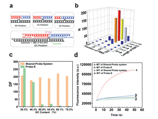 We have established and optimized the design principles of shared-probe system. To better demonstrate the function of shared-probe system in overcoming secondary structure of substrates, we synthesize a series of substrates with different GC contents. Based on those substrates, we compared shared-probe system and Endo Ⅳ assisted probe (probe combined to substrate directly, denoted as "probe-E" to be distinguished from the probe of shared-probe system) by their ability of differentiating MT/WT (strands are named Sc-MT, Sc-Sh1/Sh2, see detailed sequence in Table S1). We fixed the length of Sh2 at 25 nt to eliminate the secondary structure. As was shown in Fig. 2c, Endo Ⅳ assisted probe had better DF (differentiation factor) when the GC content of substrates was 39.3%. However, when GC content was higher than 60%, DF of Endo Ⅳ assisted Probe decreased dramatically. To the contrary, GC content had little influence on DF of shared-probe systems. Fig. 2d demonstrated the comparison of DF with and without Shared-probe system under the GC content of 70.2%. As was reported by previous literature, GC content was significantly positively correlated with the complexity of secondary structure [37, 38]. The experimental results above demonstrated that our strategy had good generality and could be applied to detect mutation in substrates with complex secondary structure.