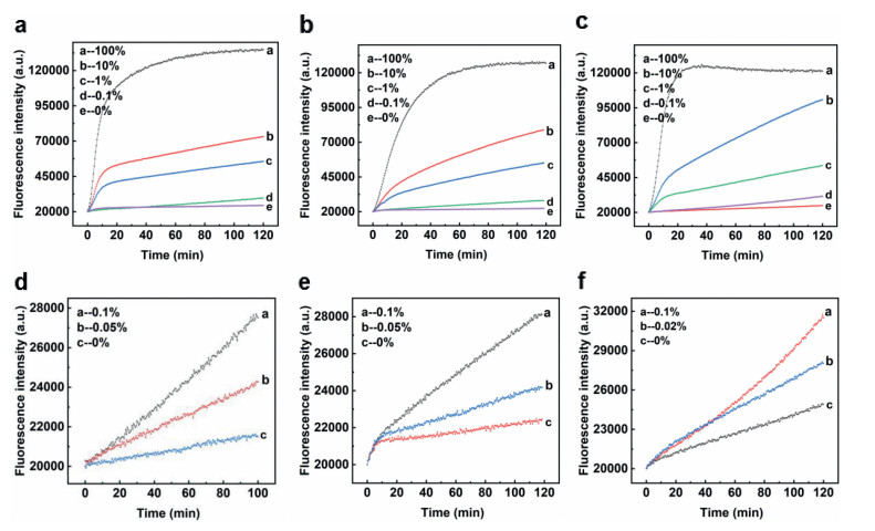 It has been demonstrated that our design was able to overcome complex secondary structure and can be applied to multiple mutations. However, in practical application situations, mutant DNA to be detected was always at low amount [45-47]. Therefore, low abundance detection on different mutations was conducted to further examine the detection ability of shared-probe system. With corresponding wild-type strands, we diluted the mutant-type strands of PTENR130Q, BRCA1-NM007294.3 and EGFR-L858R into a series of mixed substrates of different mutation abundance. Experimental results in Fig. 3 showed that the limit of detection was 0.05% for PTENR130Q and EGFR-L858R, and 0.02% for BRCA1-NM007294.3, demonstrating the ability of shared-probe system inS detecting low abundance mutations.