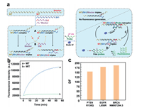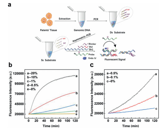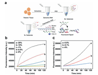 | Fig. 4. (a) The work flow of the whole detection process with clinical sample. (b, c) Detection of low abundance EGFR-L858R mutation in 110 nt genomic DNA sample. | |