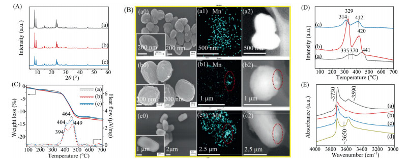 | Fig. 1. (A) XRD patterns, (B) Scanning electron microscope (SEM) (a0-c0) & scanning transmission electron microscope (STEM)-mapping (a1-c2), (C) Thermogravimetric-differential thermal analysis (TG-DTA), (D) H2-temperature programmed reduction (H2-TPR) and (E) IRspectra of OH region of Mn-Si-MEL samples synthesized by different methods. (a) Mn-S2(Seed), (b) Mn-S2(RC), (c) Mn-S2(DH). | |