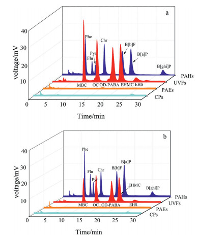 | Fig. 3. Typical chromatograms of SPME-HPLC with the NiTi@Co-NC fiber (a) and the NiTi@Co-C fiber (b) for PAHs, UVFs, CPs and PAEs. | |