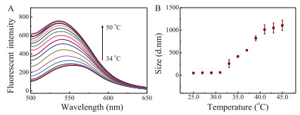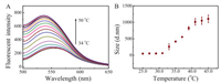 | Fig. 3. Effect of temperature on the fluorescence intensity of AuNBPs-PNMV@Apt (A) and DLS results of the AuNBPs-PNMV@Apt (B). | |