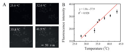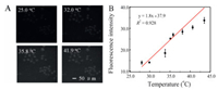 | Fig. 5. (A) Fluorescence images of MCF-7 cells got at 25.0, 32.0, 35.8 and 41.9 ℃. Scale bars: 50 μm. (B) Temperature-dependent calibration curve of AuNBPs-PNMV@Apt fluorescence intensity. The fluorescence intensity in living cells was got from images of MCF-7 cells. | |