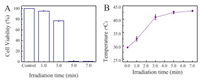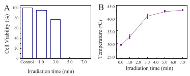 | Fig. 7. (A) The state of MCF-7 cells (alive or dead) in the control sample and the sample incubated with AuNBPs-PNMV@Apt under irradiation by an 808 nm laser for different durations. (B) Temperature variation curves were measured from MCF-7 cells labeled with AuNBPs-PNMV@Apt during different durations of 808 nm laser exposure. | |