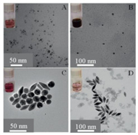| Fig. 2. TEM images of the as-grown AuNPs seeds (A), bimetallic Au/Ag products (B), Au/Ag heteronanorods (C), and AuNBPs (D). | |