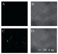 | Fig. 4. Fluorescence images of COS-7 (A, B) and MCF-7 (C, D) obtained after incubation with AuNBPs-PNMV@Apt. Scale bars in A, B, C and D: 30 μm. | |