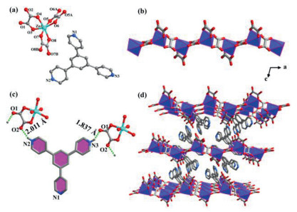 | Fig. 1. Crystal structure of 1. (a) The asymmetricunit; (b) The zinc oxolate chain; (c) H-bonding interactions between chelated oxalates and isolated TPB ligands; (d) Three-dimensional supramolecular structure. Atom legend: Zn, turquoise; N, blue; O, red; C, gray −40%. Polyhedral legend: [ZnO6], light blue. Water molecules and part H atoms are omitted for clarity. | |
