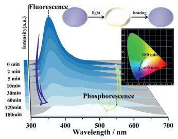 In conclusion, a zinc oxalate-based chain complex with photochromism, photo-enhanced RTP and photo-controlled WLE properties was synthesized under the assembly of a fluorescence and phosphorescence dual emission TPB ligand. The compound undergoes the electron transfer process from oxalate groups to TPB ligands upon light irradiation, which is confirmed by UV–vis, ESR, IR, XPS spectra and magnetic analysis. Meanwhile, the photogenerated radicals could lead to the changes in electronic and crystal structures of the title compound, leading to the enhanced RTP behavior. The reversible photoluminescence between blue and greenish white light emission was innovatively achieved in this photochromic zinc oxalate chain system by generation and removal of radicals using external stimuli. This study could serve as a representative architecture for rational design of novel photochromic materials with photoswitchable WLE, opening a new way for developing stimuli-switchable white light-emitting diodes.