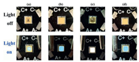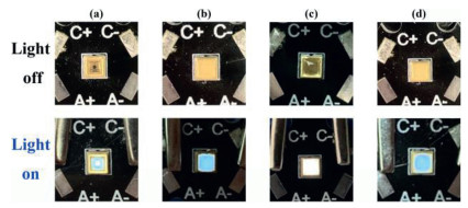 | Fig. 4. (a) Photos of commercial 270 nm UV LED in light-off and light-on states. Photos of commercial 270 nm UV LED covered by thin layer of (b) sample 1, (c) 1a and (d) after decoloration in light-off and light-on states. | |