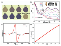 | Fig. 2. (a) Photochromism of powder samples for compound 1. (b) Time-dependent UV–vis spectra of 1. Insert: Photochromism of crystal samples. (c) Solid state ESRspectra of 1 and 1a under ambient conditions. (d) Temperature-dependent susceptibilities for 1a under a dc field of 1000 Oe. | |