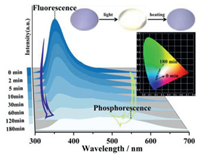| Fig. 3. Time-dependent photoluminescent spectra of 1. Insert: Photo-excited images under 270 nm irradiation during reversible photochromism; Chromaticity coordinates of 1 at different irradiation time (λex = 270 nm, 150 W; CIE = (0.20, 0.16) for 0 min, (0.21, 0.19) for 2 min, (0.22, 0.21) for 5 min, (0.23, 0.23) for 10 min, (0.24, 0.26) for 30 min, (0.25, 0.29) for 60 min, (0.26, 0.31) for 120 min, (0.27, 0.33) for 180 min). | |