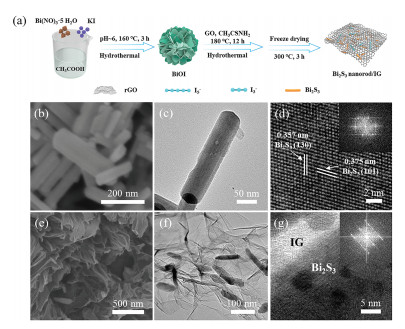 | Fig. 1. Synthesis process and characterizations of the electrodematerials. (a) Schematic diagram representing the synthesis of Bi2S3/IG. (b) SEM, (c) TEM and (d) HRTEMimages (Inset: SAED pattern) of the Bi2S3 nanorods. (e) SEM, (f) TEM and (g) HRTEM images (Inset: SAED pattern) of the Bi2S3/IG composite. | |
