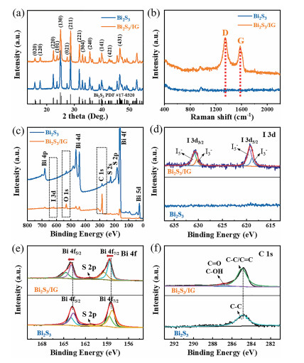 | Fig. 2. Characterization of Bi2S3 and Bi2S3/IG. (a) XRD pattern of Bi2S3 and Bi2S3/IG, with the standard PDF card of orthorhombic Bi2S3 for identification. (b) Ramanspectra of Bi2S3 and Bi2S3/IG. (c) Survey XPS spectrum of Bi2S3 and Bi2S3/IG, the dotted boxes marked the differences in peaks between the two samples. High-resolution (d) I 3d, (e) Bi 4f, and (f) C 1s XPS spectra of the Bi2S3 and Bi2S3/IG. | |
