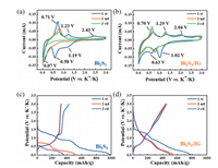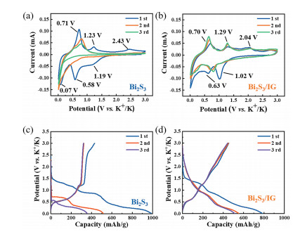 | Fig. 3. Electrochemical behaviors of the Bi2S3 and Bi2S3/IG in 5 mol/L KFSI/DME electrolyte. CV curves of (a) Bi2S3 and (b) Bi2S3/IG at a scan rate of 0.1 mV/s. Initial three galvanostatic discharge/charge curves of (c) Bi2S3 and (d) Bi2S3/IG at a current density of 50 mA/g. | |