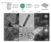 Fig. 1a showed the schematic illustration of the synthesis procedure for the Bi2S3/IG composite. BiOI nanoflowers were firstly synthesized through a hydrothermal process at 160 ℃ using Bi(NO3)·5H2O and KI as precursors. The BiOI was then re-dispersed into graphene oxide dispersion and sulfurized with thioacetamide by hydrothermal method at 180 ℃ for 12 h In this process, Bi2S3 was in-situ grew and encapsulated in graphene framework, and iodine atoms decomposed by BiOI were captured by graphene to form iodine-doped graphene. Finally, after an annealing process under Ar atmosphere at 300 ℃, the Bi2S3/I doped-rGO (denoted as Bi2S3/IG) was obtained. The morphologies of the materials were characterized using scanning electron microscopy (SEM) and transmission electron microscopy (TEM). The BiOI intermediates exhibited a nanoflower-like structure composed of multiple nanosheets (Fig. S1 in Supporting information). The microstructure of Bi2S3 exhibited a nanorod-like morphology with a length of ~200 nm and a width of ~50 nm (Figs. 1b and c). The high-resolution TEM (HRTEM) image of Bi2S3 shown in Fig. 1d revealed two sets of crystal lattice fringes with interplane spacing of 0.375 nm and 0.357 nm, corresponding to the (101) and (130) index planes. The morphologies of the Bi2S3/IG composite were shown in Figs. 1e and f, where the Bi2S3 nanorods were dispersed throughout the graphene skeleton structure. Interestingly, the graphene encapsulation further confined the growth of Bi2S3 nanorods to a length of ~100 nm and a width of ~30 nm. The interfacial boundary of Bi2S3 and iodine-doped graphene could be seen in the HRTEM image of the complex (Fig. 1g). The observed blur of the Bi2S3 lattice fringes could be linked to the overlaying of graphene sheets. Besides, the element distribution mapping results of Bi2S3/IG were displayed in Fig. S2 (Supporting information), demonstrating the presence of iodine.
