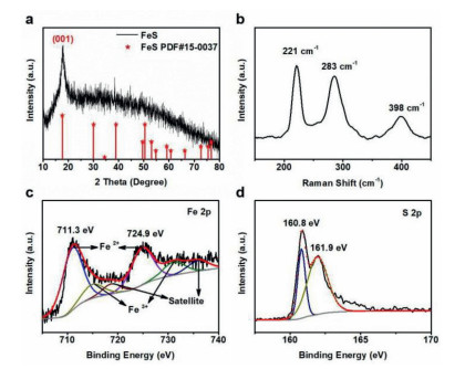 | Fig. 2. (a) XRD pattern and (b) Ramanspectrum of FeS NSs. High-resolution (c) Fe 2p and (d) S 2p XPSspectra of FeS NSs. | |
