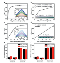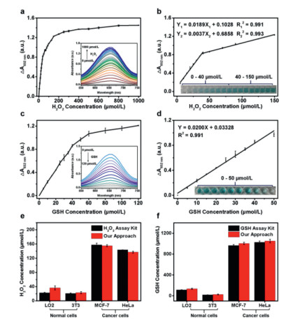 | Fig. 3. (a) The absorbance enhancement (△A652 nm = A - A0) of FeS NSs (0.4 µg/mL) and TMB (0.2 mmol/L) with different concentrations of H2O2 at pH 4.0. Inset: the UV–vis-NIR absorption curves with increasing concentrations of H2O2. A and A0 are the absorbance of FeS NSs and TMB with and without H2O2, respectively. (b) The linear calibration plots for sensing H2O2. Inset: photographs of corresponding samples. (c) The absorbance enhancement (△A′652 nm = A′0 − A′) of FeS NSs (0.4 µg/mL) with TMB (0.2 mmol/L) and H2O2 (0.1 mmol/L) in the presence of different concentrations of GSH at pH 4.0. Inset: the UV–vis-NIR absorption curves with increasing concentrations of GSH. A′0 and A′ are the absorbance of reaction system without and with GSH, respectively. (d) The linear calibration plots for sensing GSH. Inset: photographs of corresponding samples. (e) H2O2 and (f) GSH levels of normal cell (L02 and 3T3) and cancer cells (MCF-7 and HeLa) evaluated by the commercial H2O2 assay kit and FeS NSs. | |