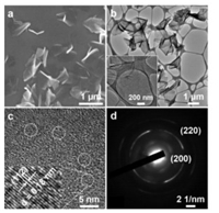 | Fig. 1. (a) SEM and (b) TEMimages of FeS NSs. Inset in (b): The partially enlarged TEM image of FeS NSs. (c) HRTEM image and (d) SAED pattern of FeS NSs. | |