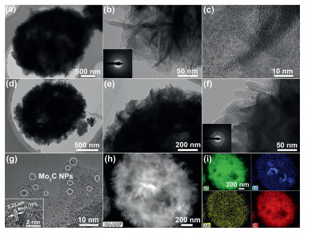 | Fig. 2. (a, b) TEM and (c) HRTEM images of Mo-DPA/NPC. (d-f) TEM, (g) HRTEM, (h) HAADF-STEM and (i) EDS elementals mapping images of N, P-Mo2C/NPC. The insets in (b) and (f) was the related SAED pattern. | |