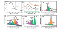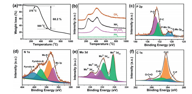 | Fig. 3. (a) TG and (b) curves of gaseous decomposition products (CH4, NH3, NH2/CH3 and PH3) derived from Mo-DPA/NPC pyrolysis process tracking by TG-MS. High-resolution XPS spectra in the (c) P 2p, (d) N 1s (overlap with Mo 3p), (e) Mo 3d and (f) C 1s regions for N, P-Mo2C/NPC. | |