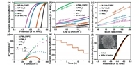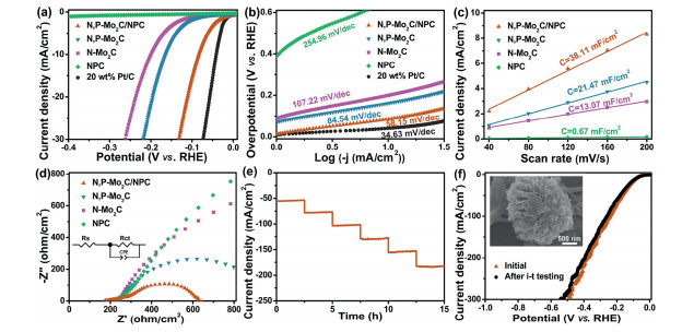| Fig. 4. (a) HER polarization curves and (b) corresponding Tafel plots of N, P-Mo2C/NPC, N, P-Mo2C, N-Mo2C, NPC and 20 wt% Pt/C in 1.0 mol/L KOH (scan rate: 5 mV/s). (c) The capacitive currents as a function of scan rates. (d) Nyquist plots with 300 mV overpotential. (e) Multi-potential process of N, P-Mo2C/NPC. The potential started from 180 mV to 430 mV, with an increment of 50 mV per 2.5 h. (f) Polarization curves of N, P-Mo2C/NPC before and after long-time HER tests. Inset: the FESEM image of N, P-Mo2C/NPC after i-t test. | |