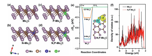 | Fig. 5. The geometric configurations of (a) pristine Mo2C, (b) N-Mo2C, (c) P-Mo2C and (d) N, P-Mo2C. (e) ΔGH* calculated at the equilibrium potential of different models. Inset in (e) is the Bader charges of N, P-Mo2C. (f) Calculated density of states for pristine Mo2C and N, P-Mo2C. The Fermilevel is set at 0 eV. | |