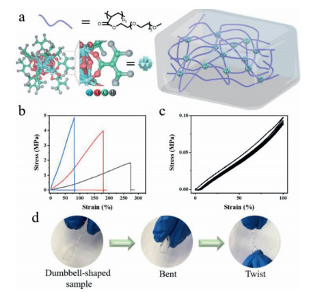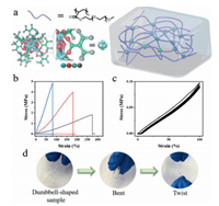 | Fig. 1. Mechanical property of PZrCCs. (a) Illustration of polymer nanocomposite integrated by Zr-oxo MCs. (b) Tensile stress-strain curves of PZrCCs-1 (black line), PZrCCs-2 (red line) and PZrCCs-3 (blue line). (c) Five loading-unloading cycles of the PZrCCs-1 without interval. (d) Photographs of PZrCCs in a dumbbell shape with bending and twisting. | |
