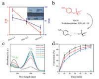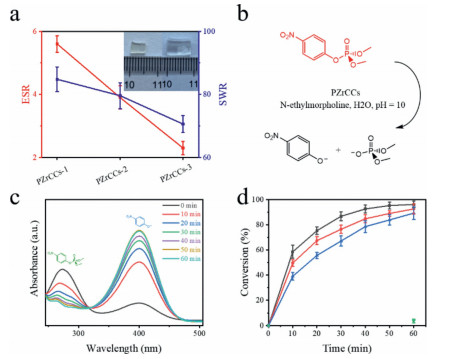 | Fig. 2. Solvent trapping and catalytic property of PZrCCs. (a) Solvent capture parameters of PZrCCs in deionized water, in which the left side shows the equilibrium swelling ratio (ESR) and the right side shows the solvent content ratio (SWR) (inset: photograph of before (left) and after (right) swollen state of PZrCCs-2). (b) Reaction conditions for the catalytic decomposition of DMNP using PZrCCs. (c) Ultraviolet-visible monitoring of the formation of p-nitrophenoxide. Left peak indicates the wavelength at which DMNP absorbs and right peak indicates the absorbance of p-nitrophenoxide, signifying decomposition has occurred. (d) Percentage conversion to p-nitrophenoxide versus time for PZrCCs-1 (black), PZrCCs-2 (red), PZrCCs-3 (blue) and background reaction (green). The error bars indicate the standard deviation of three independent catalytic tests. | |
