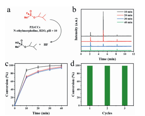 | Fig. 3. Evaluation of the catalytic hydrolysis activity of PZrCCs on GD. (a) Reaction conditions for the catalytic decomposition of GD using PZrCCs. (b) Gas chromatography (GC) monitoring of the destruction of GD. Intensity of signal at 5.08 min indicates concentration of GD. (c) Conversion efficiency of GD hydrolysis versus time for PZrCCs-1(black squares), PZrCCs-2 (red circles), PZrCCs-3 (blue triangles). The error bars indicate the standard deviation of three independent catalytic tests. (d) Recycle tests on the catalytic degradation of real CWAs GD base on PZrCCs-1. | |